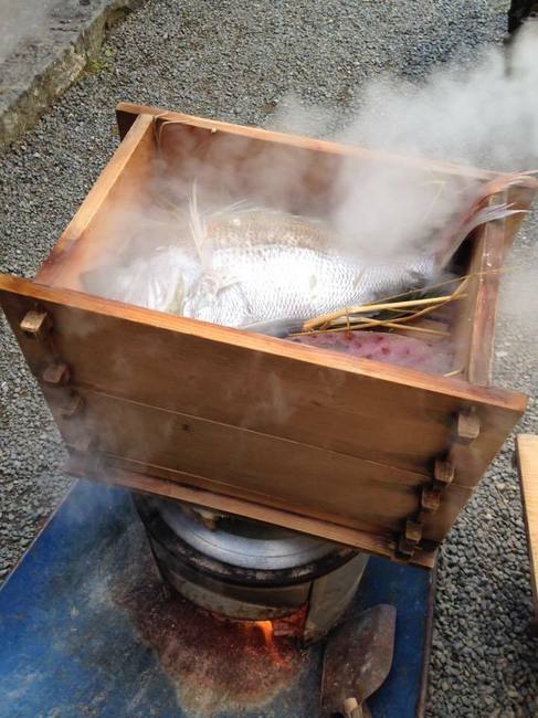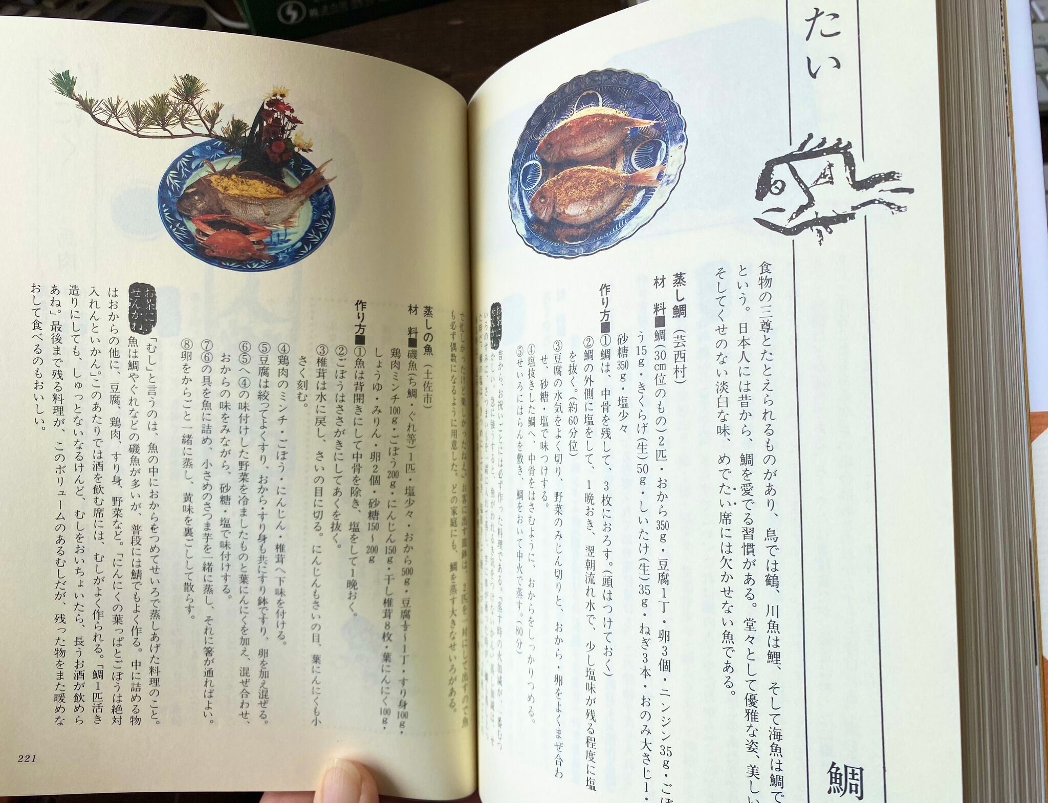 「土佐の味 ふるさとの台所」に掲載されている鯛の「玉蒸し」の作り方を、優しいタッチの色鉛筆画で図解した絵はがきです。